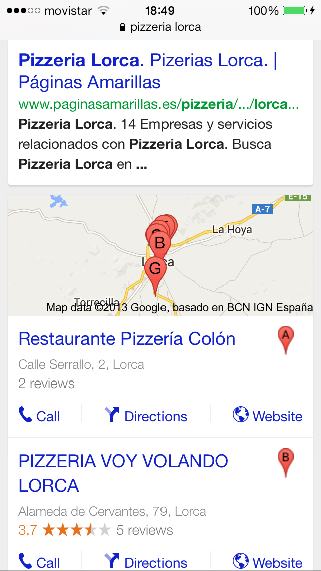 Cuando una persona realiza una búsqueda de por ejemplo una pizzería de una ciudad que no conoce y va caminando por la calle y la hace a través de su dispositivo móvil, el resultado perfecto es que le aparezca el número de teléfono para realizar la reserva y el mapa para saber como llegar, además al aparecer el mapa vamos a poder iniciar una navegación con nuestro dispositivo móvil que nos va a llevar a la puerta del establecimiento.